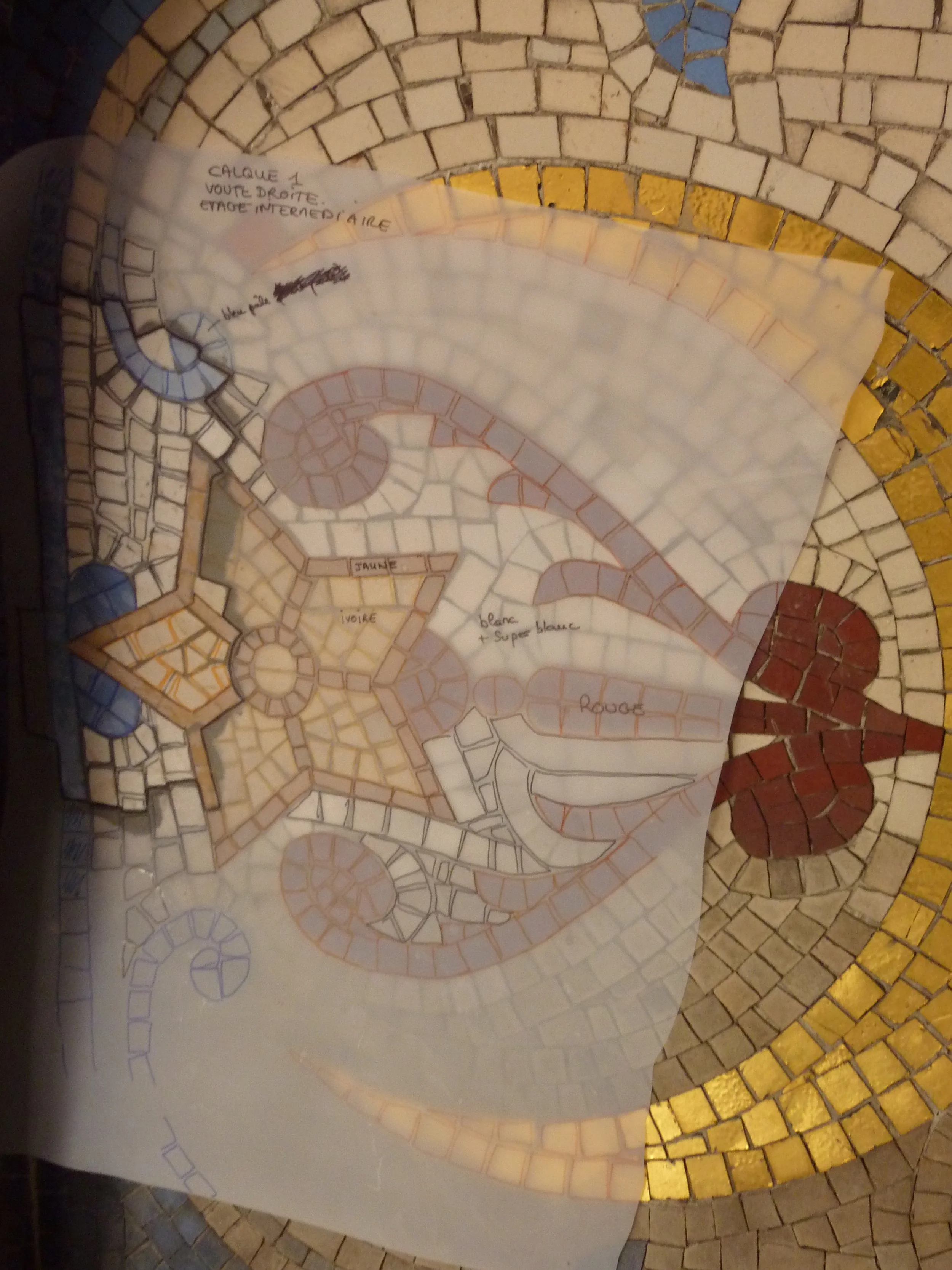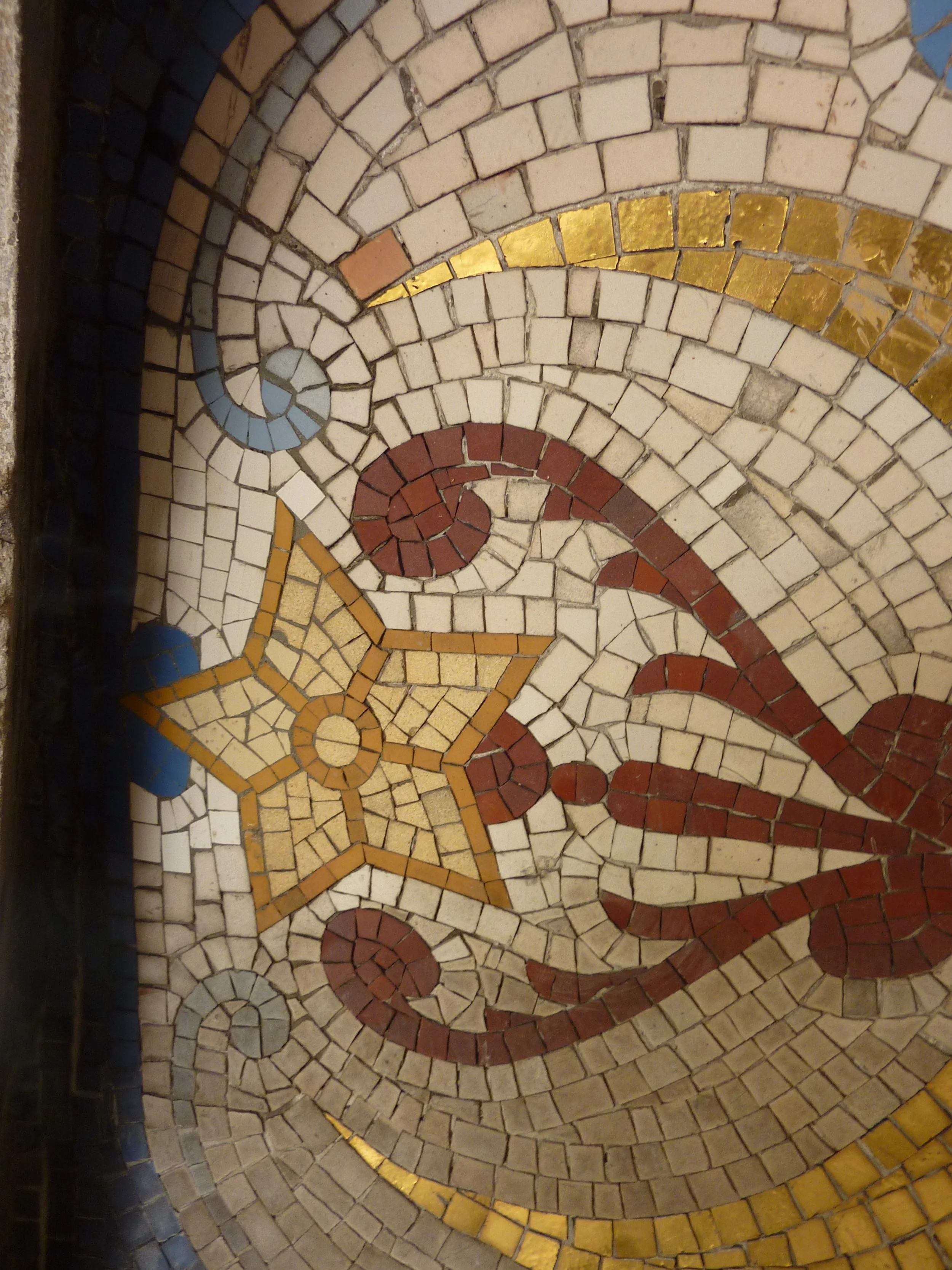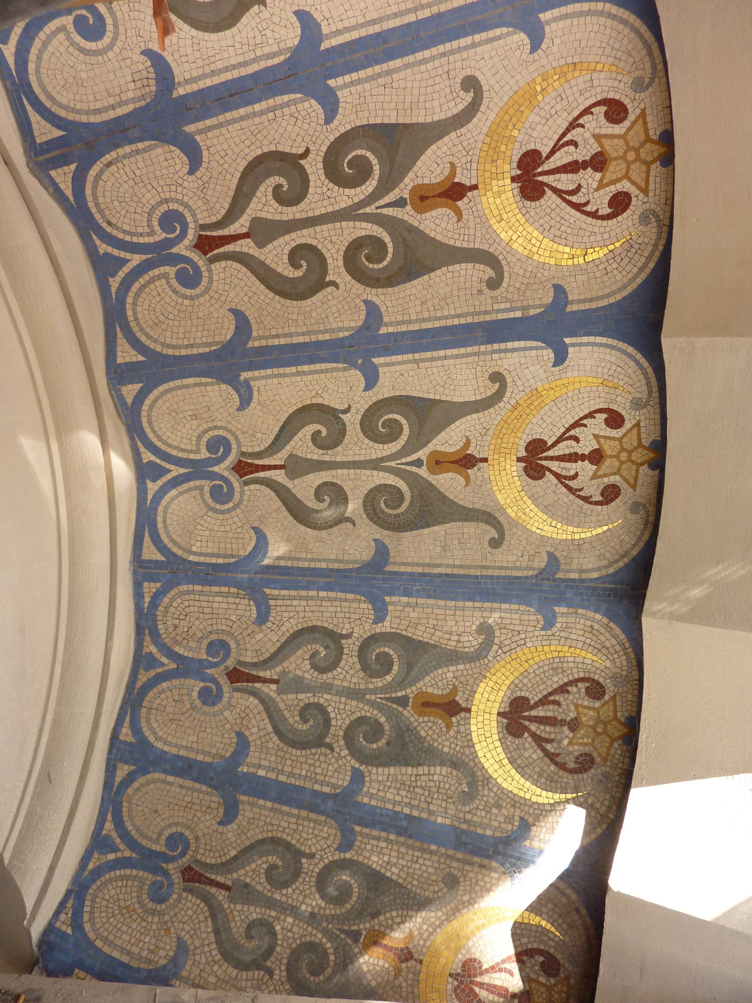 • Décors composés de tesselles de grès cérame et de pâtes de verre dorées vénitiennes